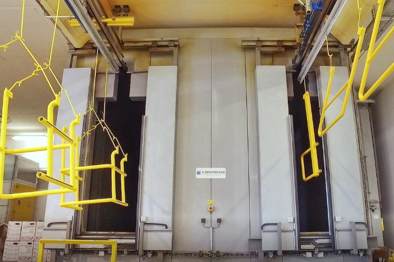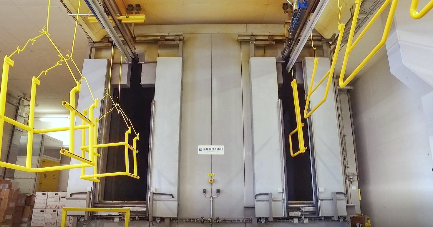 Unser Beschichtungsroboter ist mit Hub- und Hängefördersystemen verbunden.